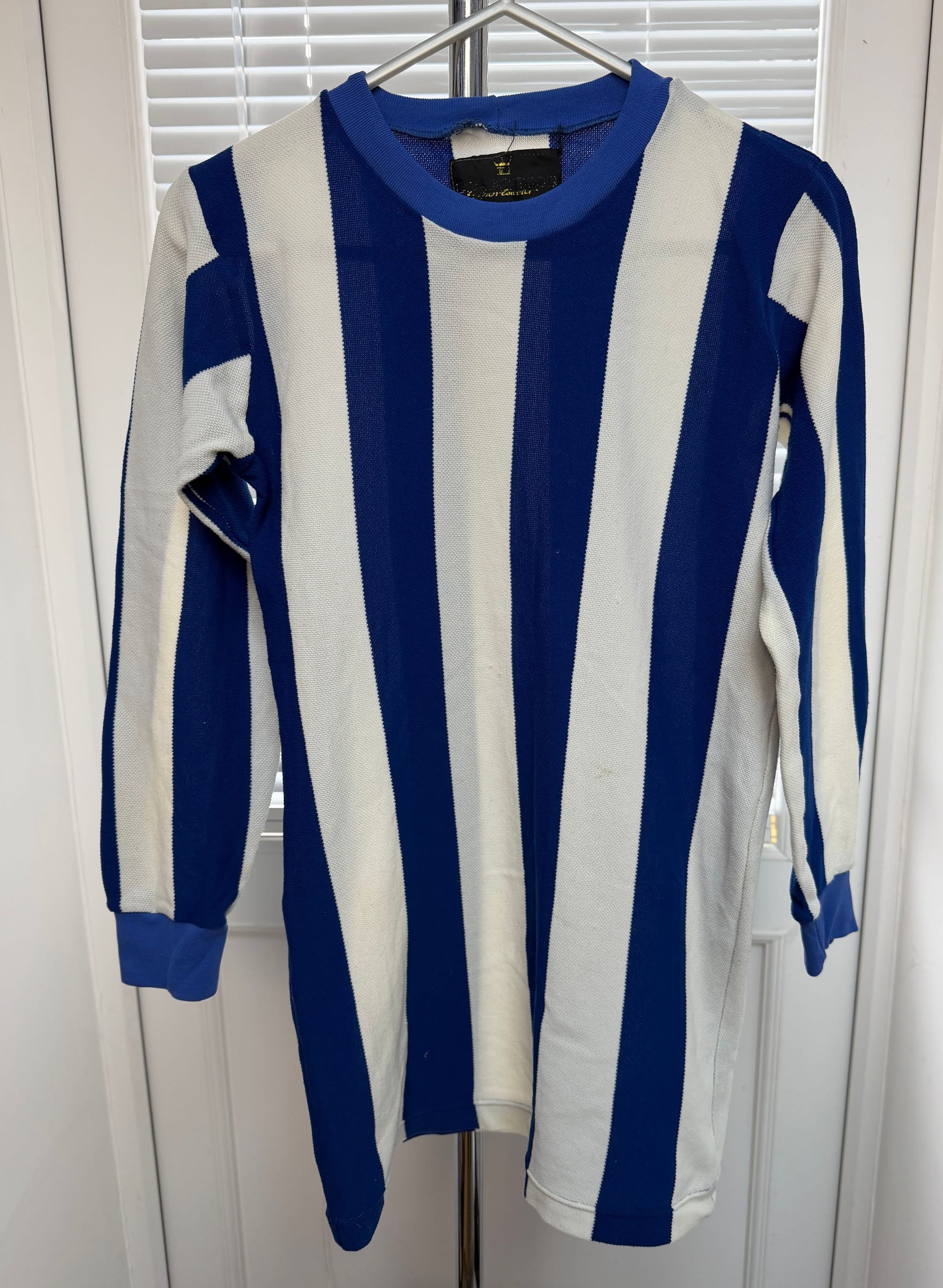 This is a match shirt wth a difference. On the normal match shirts there was a white panel imprinted within the stripes on the back for the number to go. In the official replica shirts the back was all stripes. This shirt has a white patch applied over the top of the stripes and then the number applied. This could be a reserve team shirt as it doesn't have any league patches on the sleeves.