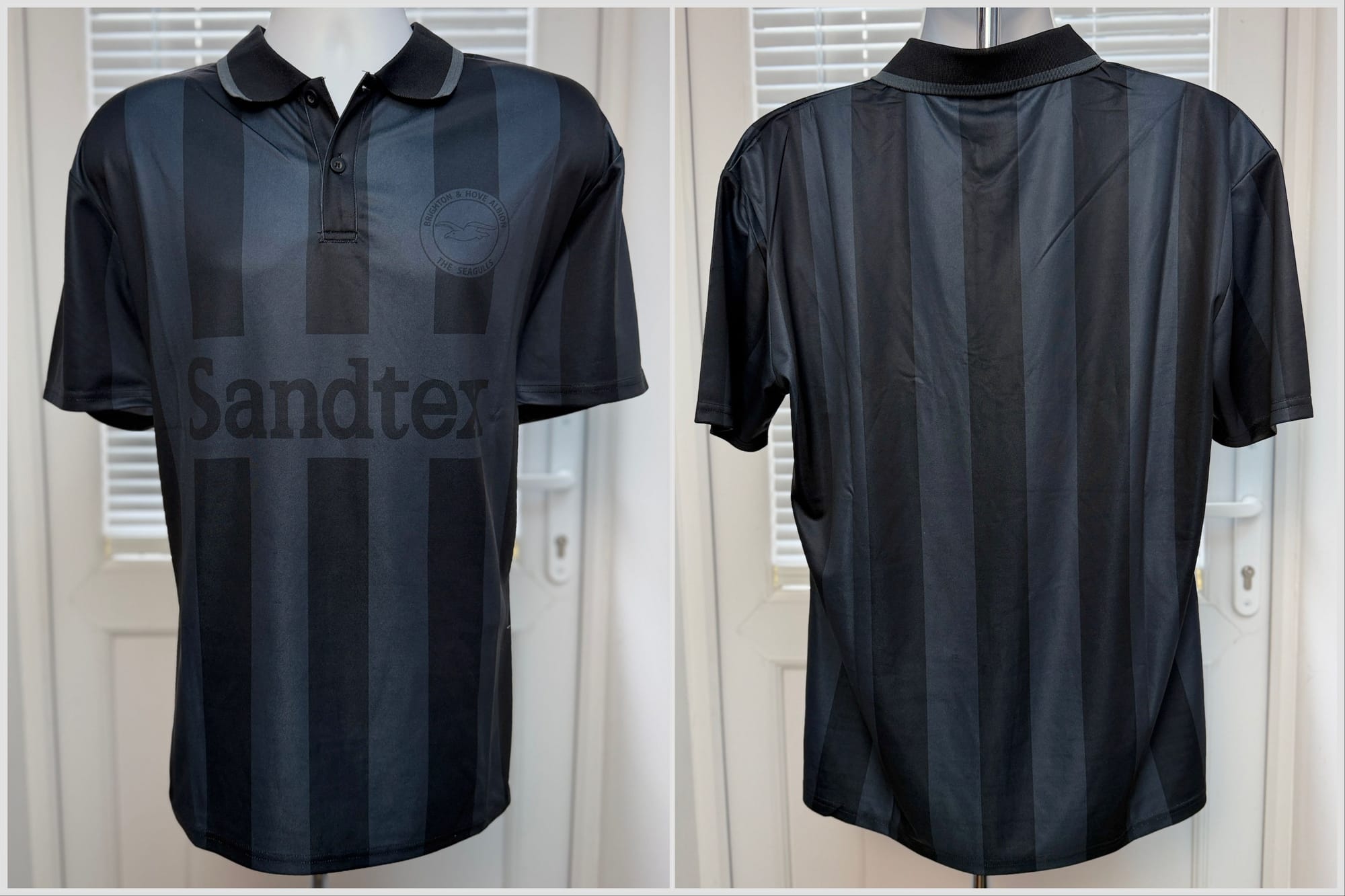 Matchworn away shirt from the very beginning of the season as the Sandtex logo is printed onto a white flock panel that has been heat applied to the shirt. This shirt was only used for one game, away at Swansea in August 1997. After then the shirts had the Sandtex logo screen printed in white direct to the shirt. This version was never available for fans to buy.